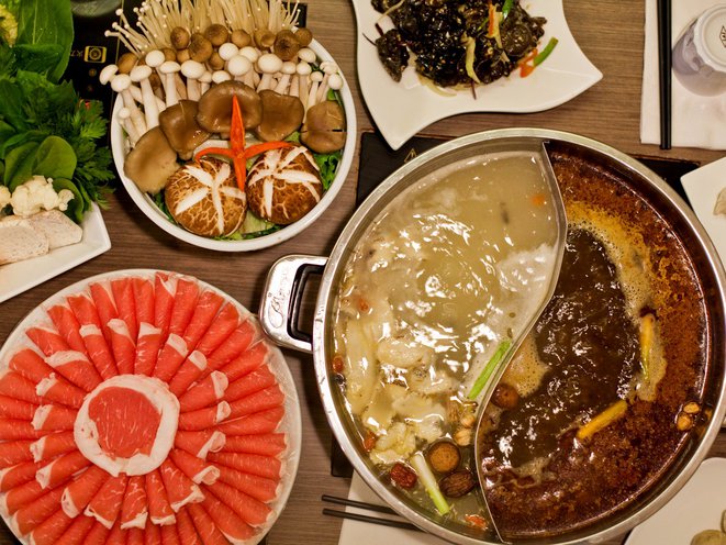 Dozens of healthy herbs go into the soup base alone; .. Hot pot is a singularly social meal during which diners cook vegetables, noodles and meats in a pot of simmering broth in the center of their table.
